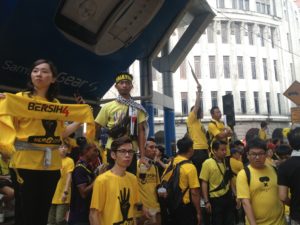 このデモは、Bersih(清掃、清廉)という名前の団体&活動で、公正選挙、汚職批判、首相退任をスローガンに掲げています。