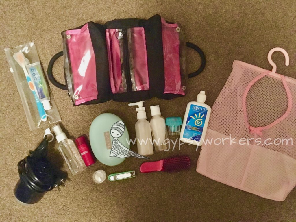 そしてメッシュ地のフック付きのバッグがあると、これだけ持ってバスルームに引っ掛けられる&濡れてもすぐ乾くのでおすすめです。
